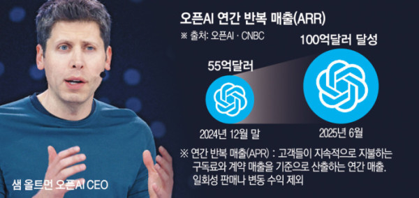 오픈AI의 ARR에는 개인 소비자용과 기업용 챗GPT 구독료와 애플리케이션프로그래밍인터페이스(API) 등에서의 매출이 포함됐다. 최대 투자사인 마이크로소프트(MS)와의 라이선스 매출과 대규모 일회성 계약은 제외됐다.