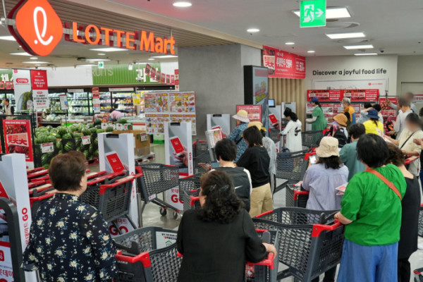 ▲서울시 노원구에 위치한 롯데마트 중계점 입구에서 고객이 매장 오픈을 기다리고 있다. (사진제공=롯데쇼핑)