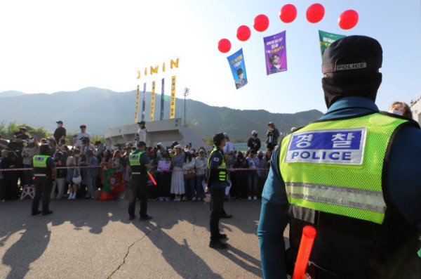 ▲방탄소년단(BTS) 지민과 정국이 전역을 앞둔 11일 오전 경기도 연천군의 한 부대 인근에 팬들이 모이자 경찰들이 현장에 배치돼있다. (뉴시스)