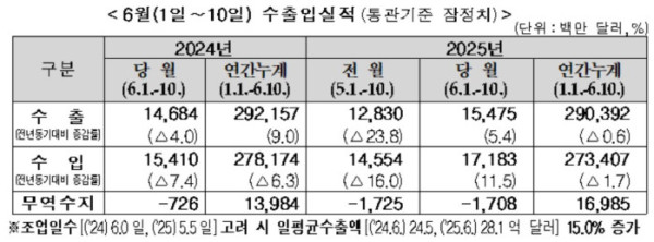 관세청이 11일 발표한 6월 1∼10일 수출입 현황에 따르면 수출액(통관 기준 잠정치)은 154억7500만 달러로 지난해 같은 기간보다 5.4% 증가했다.
