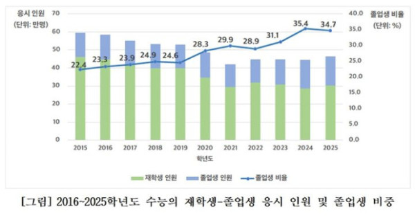 11일 한국교육과정평가원이 국회 교육위원회 더불어민주당 김문수 의원에게 제공한 2016∼2025학년도 수능 응시 현황에 따르면 고교 졸업생(검정고시 합격자 포함)의 비중은 2016학년도 23.3%에서 2025학년도 34.7%로 늘었다. 10년 새 11.4%포인트 늘어난 것이다.