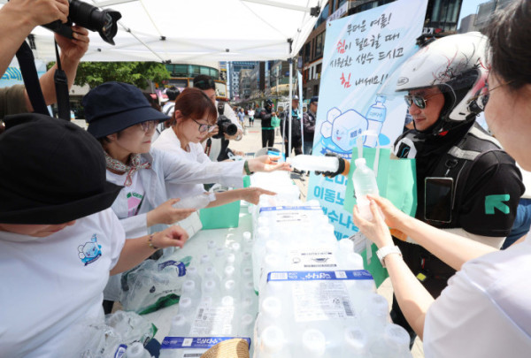 11일 서울 종로구 청계천 장통교에서 열린 ‘2025 이동노동자 생수나눔 공동 캠페인’이 열렸다. 이번 캠페인은 본격적인 혹서기를 앞두고 야외에서 일하는 이동노동자의 온열질환 예방을 위해 마련됐으며, 이날부터 서울 시내 31개 노동센터, 쉼터에서 제주삼다수 10만병을 수령할 수 있다.