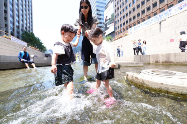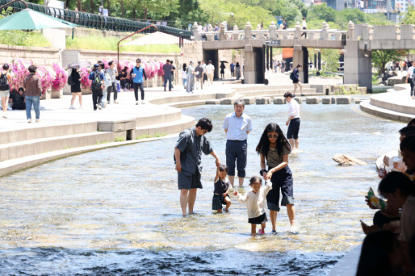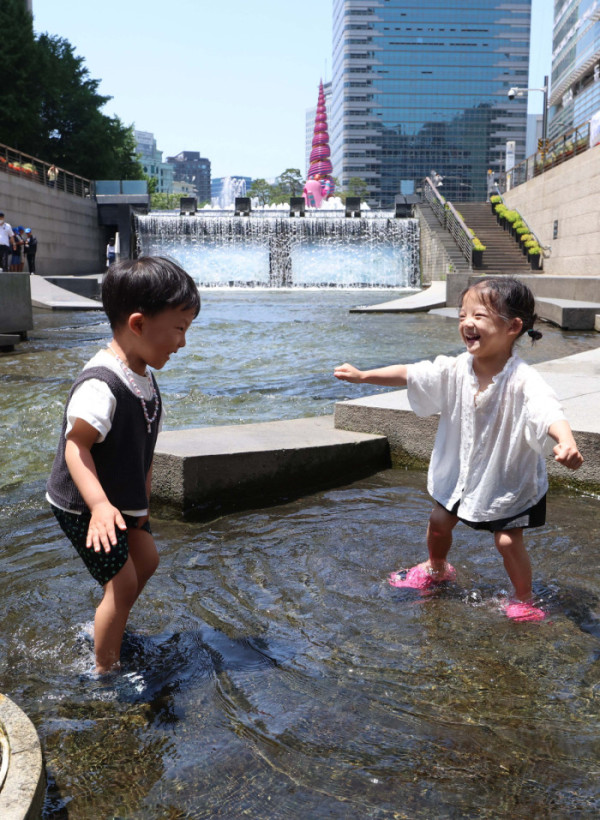 ▲청계천의 상류구간이 20년 만에 처음 개방됐다. 전국이 30도 안팎의 더위를 보인 11일 서울 종로구 청계천에서 열린 ‘청계천 물 첨벙첨벙’ 행사에서 아이들이 시원한 물에 발을 담그며 더위를 식히고 있다. 물 첨벙첨벙은 서울시가 청계천 복원 20주년을 맞아 ‘2025 워터서울(Water Seoul)’ 행사의 일환으로 마련했으며, 22일까지 청계폭포에서 광통교 구간까지 직접 들어가 물의 흐름을 체험해 볼 수 있다. 신태현 기자 holjjak@