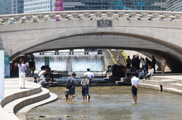 ▲청계천의 상류구간이 20년 만에 처음 개방됐다. 전국이 30도 안팎의 더위를 보인 11일 서울 종로구 청계천에서 열린 ‘청계천 물 첨벙첨벙’ 행사에서 외국인 관광객들이 시원한 물에 발을 담그며 더위를 식히고 있다. 물 첨벙첨벙은 서울시가 청계천 복원 20주년을 맞아 ‘2025 워터서울(Water Seoul)’ 행사의 일환으로 마련했으며, 22일까지 청계폭포에서 광통교 구간까지 직접 들어가 물의 흐름을 체험해 볼 수 있다. 신태현 기자 holjjak@