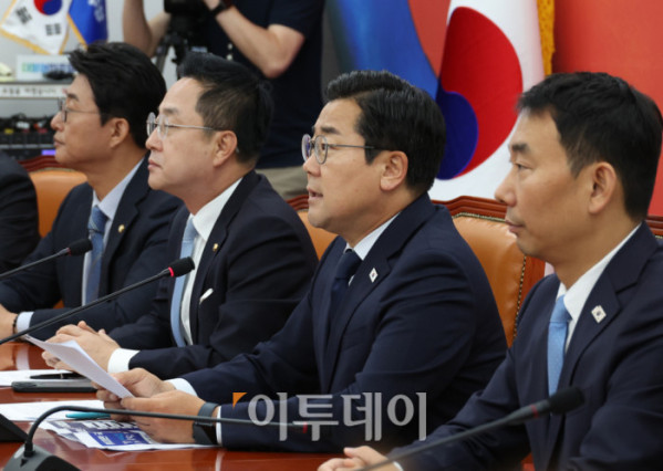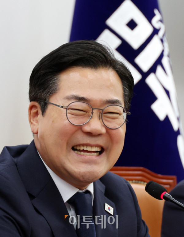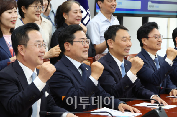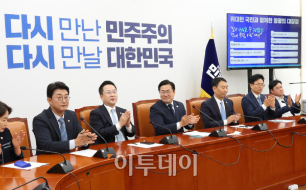 ▲박찬대(가운데) 더불어민주당 대표 직무대행 겸 원내대표가 12일 서울 여의도 국회에서 고별 기자간담회를 마치고 박수를 치고 있다. 이날 박 원내대표는 "윤석열 정권과 치열하게 싸워, 주권자 국민이 주인인 나라 진짜 대한민국이 열렸다"며 "이 정도면 제가 민주당 1기 원내대표로서 참 보람 있었다, 유종의 미를 거뒀다, 이렇게 자부심을 가져도 되지 않을까 자평해 본다"고 말했다. 고이란 기자 photoeran@