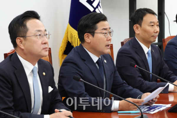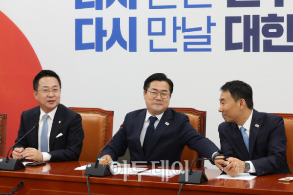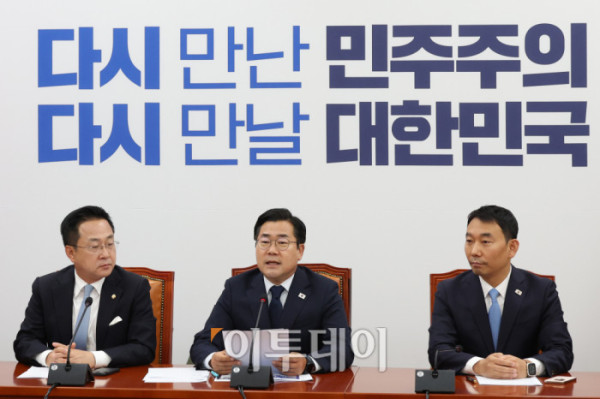 ▲박찬대(가운데) 더불어민주당 대표 직무대행 겸 원내대표가 12일 서울 여의도 국회에서 열린 고별 기자간담회에서 박성준(왼쪽) 원내수석부대표와 김용민 원내정책수석부대표의 손을 잡으며 격려하고 있다. 이날 박 원내대표는 "윤석열 정권과 치열하게 싸워, 주권자 국민이 주인인 나라 진짜 대한민국이 열렸다"며 "이 정도면 제가 민주당 1기 원내대표로서 참 보람 있었다, 유종의 미를 거뒀다, 이렇게 자부심을 가져도 되지 않을까 자평해 본다"고 말했다. 고이란 기자 photoeran@