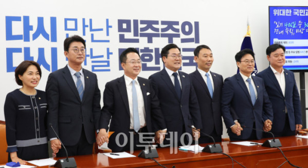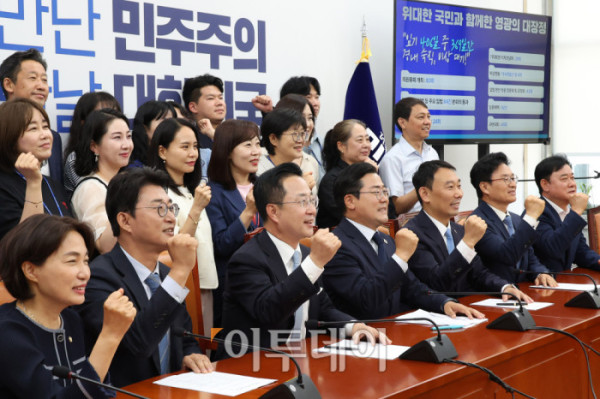 ▲박찬대(가운데) 더불어민주당 대표 직무대행 겸 원내대표가 12일 서울 여의도 국회에서 고별 기자간담회를 마치고 기념촬영을 하고 있다. 이날 박 원내대표는 "윤석열 정권과 치열하게 싸워, 주권자 국민이 주인인 나라 진짜 대한민국이 열렸다"며 "이 정도면 제가 민주당 1기 원내대표로서 참 보람 있었다, 유종의 미를 거뒀다, 이렇게 자부심을 가져도 되지 않을까 자평해 본다"고 말했다. 고이란 기자 photoeran@