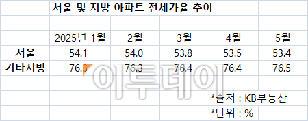 17일 KB부동산 통계 분석 결과 5월 기준 기타 지방 아파트 전세가율은 76.5%로 2022년 12월 76.5% 이후 2년 5개월 만에 가장 높은 수준을 기록했다. 서울과 주요 광역시를 제외한 기타 지방 아파트 전세가율은 1월 76.3%를 기록한 뒤 5월까지 꾸준히 우상향했다.