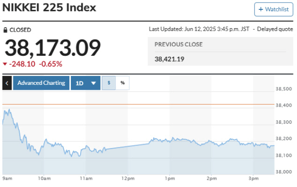 일본증시 닛케이225지수는 전 거래일 대비 248.10포인트(0.65%) 하락한 3만8173.09에, 토픽스지수는 5.75포인트(0.21%) 내린 2782.97에 마감했다.