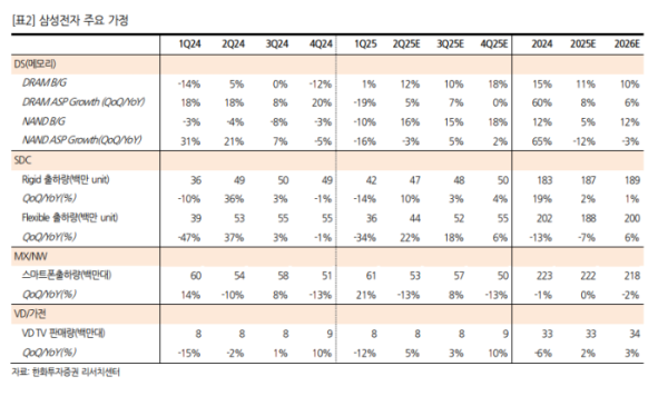 또 “2분기 예상 실적은 매출과 영업이익이 각각 직전 분기 대비 4%, 8% 감소한 75조7000억 원과 6조1000억 원”이라며 “DS 부문 이익이 컨벤셔널 디램 가격 상승으로 개선되겠지만, 환율 하락에 따른 부정적 효과와 HBM3E 12단 시장 진입 지연에 따른 출하량 제한적 증가, 파운드리 적자 개선 지연 등으로 이익 개선이 다소 제한될 것”이라고 예상했다.
