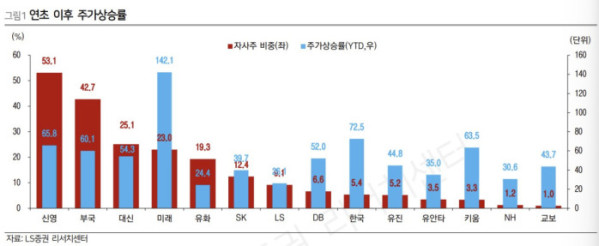 이어 "일부 증권사의 PBR은 0.9배까지 상승했으며, 특히 자사주 보유비중이 높은 회사의 주가상승 폭이 전반적으로 크게 나타났다"며 "최근 주가 급등으로 대형사 배당수익률은 평균 4% 수준까지 하락했다"고 짚었다.
