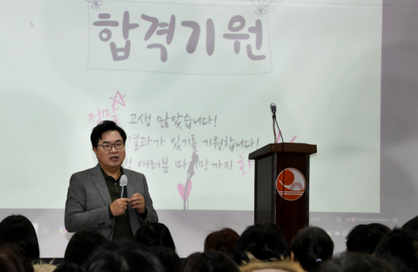 ▲박일하 동작구청장이 지난해 12월 입시지원센터 주관으로 열린 ‘정시 전형 대비 명사 초청 입시설명회’에 참석해 인사말을 하고 있다. (사진제공=동작구)
