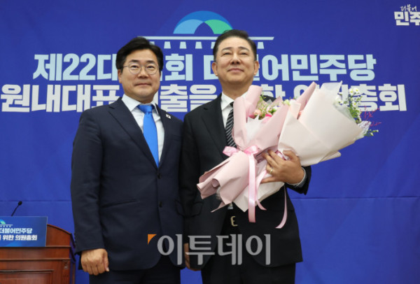 13일 서울 여의도 국회에서 열린 제22대 국회 더불어민주당 제2기 원내대표 선출 의원총회에서 김병기 신임 원내대표가 꽃다발을 들고 기념촬영을 하고 있다. 고이란 기자 photoeran@