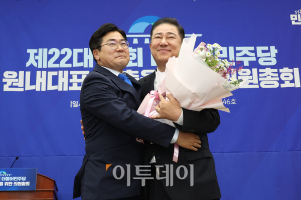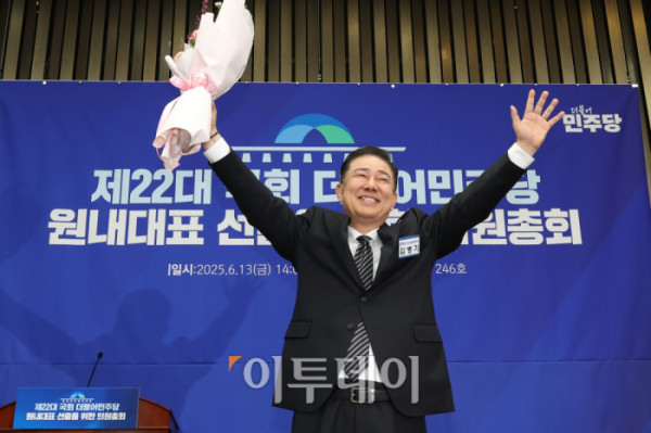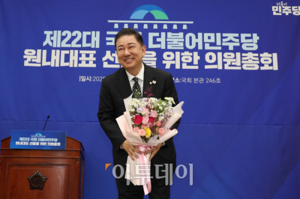 ▲13일 서울 여의도 국회에서 열린 제22대 국회 더불어민주당 제2기 원내대표 선출 의원총회에서 김병기 신임 원내대표가 꽃다발을 들고 인사하고 있다. 고이란 기자 photoeran@