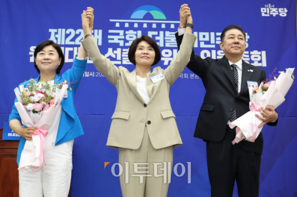 ▲13일 서울 여의도 국회에서 열린 제22대 국회 더불어민주당 제2기 원내대표 선출 의원총회에서 김병기 신임 원내대표가 꽃다발을 들고 참석자들과 기념촬영을 하고 있다. 왼쪽부터 서영교 후보, 한정애 선관위원장, 김병기 신임 원내대표. 고이란 기자 photoeran@