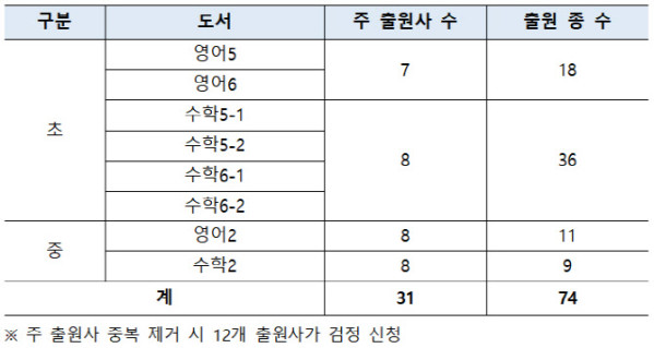 이번 검정 접수는 초등학교 5~6학년, 중학교 2학년 수학·영어 과목을 대상으로 진행됐으며, 31개 출원사에서 접수됐다. 다만 주 출원사 간 중복 접수한 경우를 제외하면 총 12개 출원사가 검정을 신청했다.