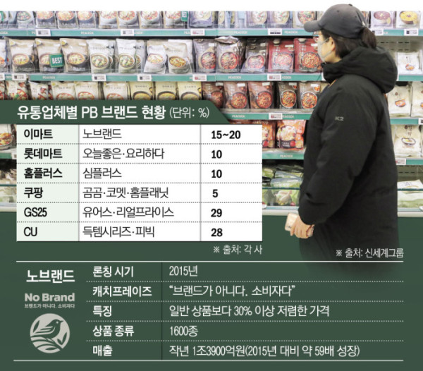 노브랜드의 이런 전략으로 기존 ‘PB=저품질’ 편견도 깨졌다. 자연스럽게 대형마트, 편의점, 이커머스 PB 경쟁을 촉발시켰다. 이 덕에 국내 PB 시장 규모도 가파르게 커졌다. 롯데마트에 따르면 요리하다(가정간편식), 오늘좋은(가공·생활용품) 등 2000개가 넘는 PB 제품을 판매 중이다. 홈플러스의 PB는 2000년 280여 종에 불과했지만 현재 1400여 종 수준으로 늘었다.