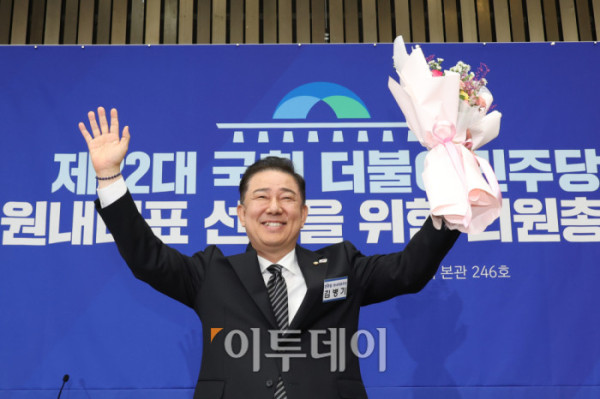 ▲13일 서울 여의도 국회에서 열린 제22대 국회 더불어민주당 제2기 원내대표 선출 의원총회에서 김병기 신임 원내대표가 꽃다발을 들고 기념촬영을 하고 있다. 고이란 기자 photoeran@