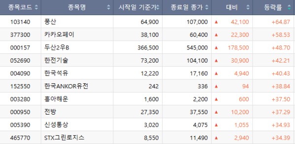 이외 두산2우B(48.70%), 한국석유(40.43%), 한국ANKOR유전(38.84%), 흥아해운(37.50%), 전방(37.29%), STX그린로지스(34.39%)가 상승했다.
