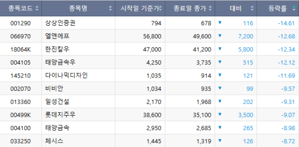 이외 한진칼우(-12.34%), 태양금속우(-12.12%), 다이나믹디자인(-11.69%), 비비안(-9.57%), 일성건설(-9.31%), 롯데지주우(-9.07%), 태양금속(-8.98%), 체시스(-8.72%) 등이 하락했다.