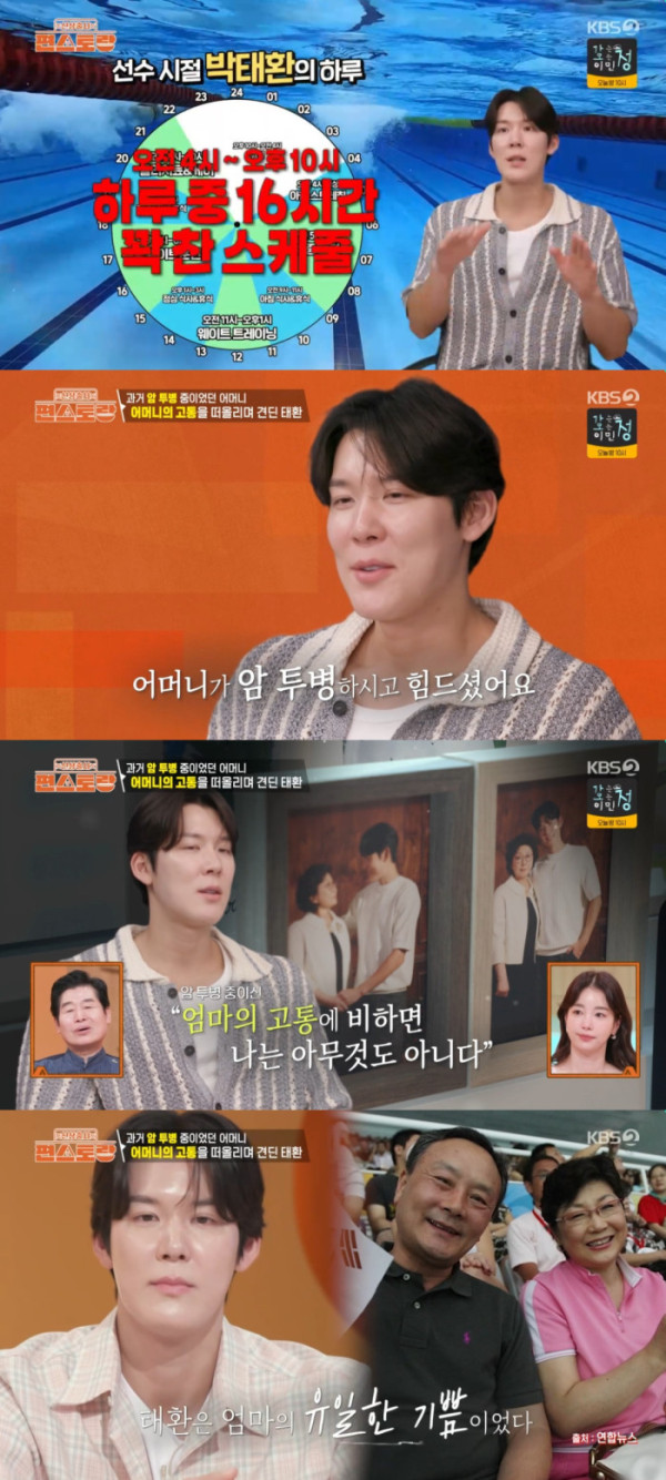 박태환은 “너무 힘들어 심장이 터질 것 같아도 이 고통이 엄마가 힘들었던 것에 비빌 수 없다고 생각했다”라며 “가쁜 호흡에 이러다 죽겠다 싶어도 진짜 죽지는 않지 않냐. 엄마의 고통을 생각하면 그저 투정부리는 것밖엔 안됐다”라고 말했다.