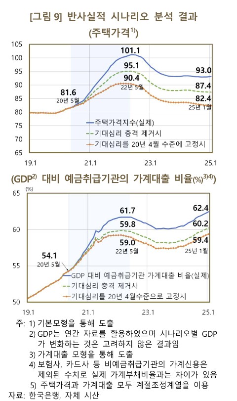 기대심리를 2020년 4월 수준으로 고정하면 올해 1월 기준 주택가격지수는 82.4로 실제수치 93.0보다 11.4% 낮았을 것으로 추정했다. 국내총생산(GDP) 대비 예금취급기관의 가계대출 비율 역시 올해 1월 기준 실제수치인 62.4%보다 낮은 59.4%를 기록했을 것으로 봤다.