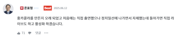 그는 11일 자신의 온라인 소통 채널 ‘청년의 꿈’에서 ‘TV홍카콜라를 이용해 소통해달라’는 한 지지자의 요청에 “홍카콜라를 맞든 지 오래되었고 처음에는 직접 출연했으나 정치 일선에 나가면서 자제했는데 돌아가면 직접 라이브도 하고 활성화하겠다”고 답했다.