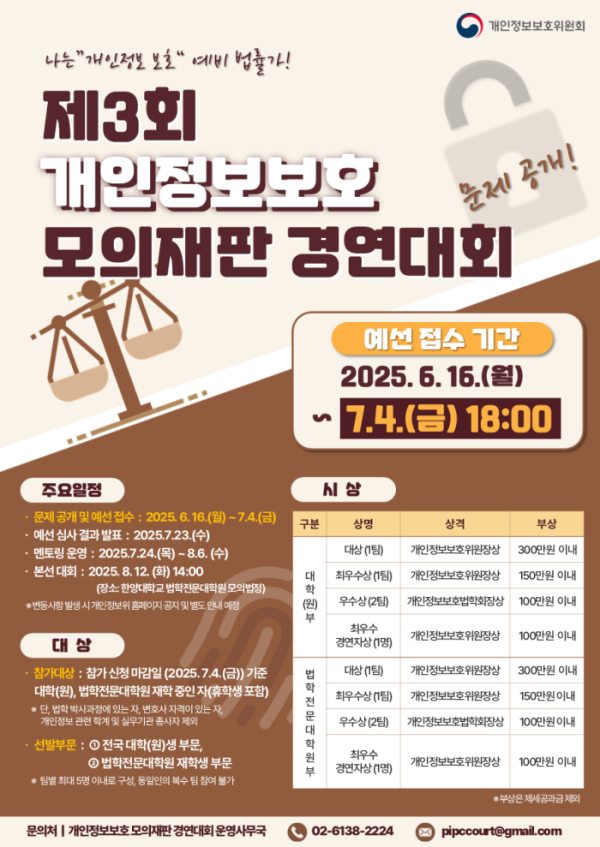 개인정보보호위원회는 '인공지능 시대의 데이터 처리와 개인정보 안전조치'를 주제로 개인정보보호 모의재판 경연대회를 연다고 15일 밝혔다. 올해로 3회째를 맞는 이번 대회는 인공지능 학습·맞춤형 광고·데이터 처리 과정에서 일어나는 개인정보 유출 등 다양한 개인정보 관련 이슈를 다룬다. 부문별 예선 심사(서면)에서 선발된 총 8개 팀은 8월 12일 한양대 모의법정에서 개최될 본선 대회에 참가하게 된다.