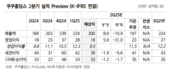 이 연구원은 “2분기 연결 기준 매출과 영업이익은 각각 전년 대비 9% 증가한 1998억 원, 6% 늘어난 190억 원으로 추정한다”며 “이중 국내 매출은 1555억 원으로 예상되며, 음식물처리기 출시 등 다각화 노력이 매출 성장으로 이어질 전망”이라고 진단했다.