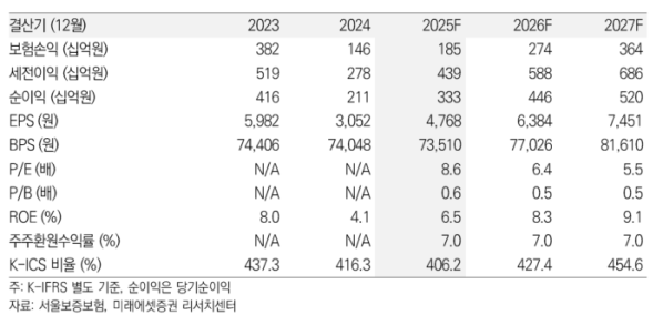 정태준 미래에셋증권 연구원은 "서울보증보험은 규제수준인 130%를 압도적으로 웃도는 K-ICS 비율을 보유하고 있다는 점, 해약환급금 준비금 적립 부담이 없어 처분전이익잉여금과 배당가능이익이 충분하다는 점에 근거해 향후 실적과 관계없이 주당 2865원의 주당배당금을 유지할 것으로 예상한다"며 "최근 주가 상승에도 불구 최소 7.0% 이상의 배당수익률은 기대할 수 있다는 점을 시사한다"고 말했다.
