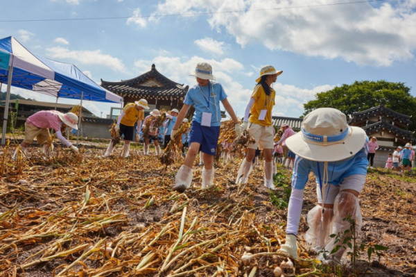 ▲의성마늘햄 가족캠프 참가자들이 의성마늘 수확 체험을 하고 있다. (사진제공=롯데웰푸드)