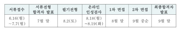 해외투자 전문기관인 공사 업무 특성상 일정 수준 이상의 어학 능력은 요구된다. 전형은 △서류접수(6월 16일~7월 7일) △서류전형 합격자 발표(7월 말) △필기전형(8월 2일) △온라인 인성 검사(8월 18~19일) △1차 면접(8월 말) △2차 면접(9월 중순) 순으로 진행된다. 최종합격자는 9월 말에 발표할 예정이다.