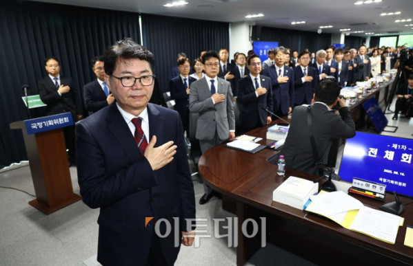 ▲이한주 국정기획위원회 위원장 등 참석자들이 16일 서울 종로구 정부서울청사 창성동 별관에서 열린 1차 전체 회의에서 국민의례를 하고 있다. 이날 출범한 위원회는 정부가 임기 중 추진할 국정과제의 로드맵을 제시하며 이재명 정부의 100대 국정과제를 정리, 과제별로 추진 시점과 목표 등을 정해 '국정운영 5개년 계획'을 마련할 방침이다. 조현호 기자 hyunho@