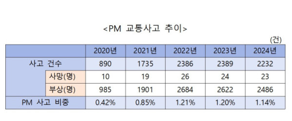 전체 사고에서 차지하는 비중도 줄어들었다. PM 사고 비중은 2022년 1.21%까지 올랐다가 2023년 1.2%, 지난해 1.14%로 감소 중이다. 부상자는 2022년 2684명에서 2023년 2622명, 2024년 2486명으로 줄었고, 사망자도 2022년 26명에서 2023년 24명, 2024년 23명으로 감소하는 추세다.