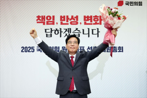 16일 서울 여의도 국회에서 열린 ‘2025 국민의힘 원내대표 선출 선거 의원총회’에서 송언석 의원이 새 원내대표로 당선됐다.