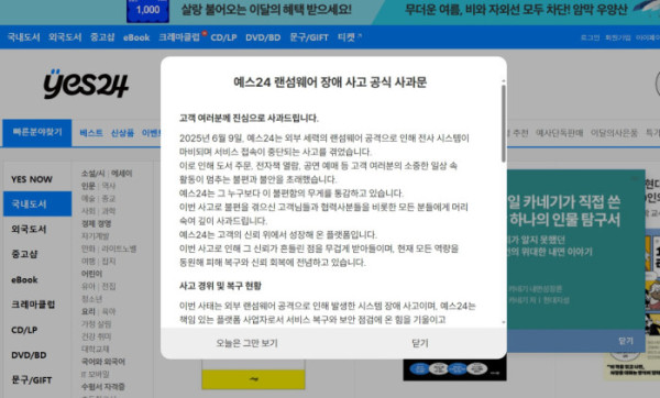 인터넷서점이자 공연 예매 플랫폼인 예스24(yes24)가 랜섬웨어 해킹 사고 발생 일주일 만에 공식 사과와 함께 1차 보상안을 발표했다.