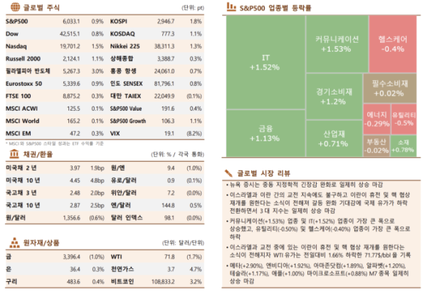 [글로벌 증시요약] 뉴욕증시, 중동 지정학 긴장 완화로 상승 마감
