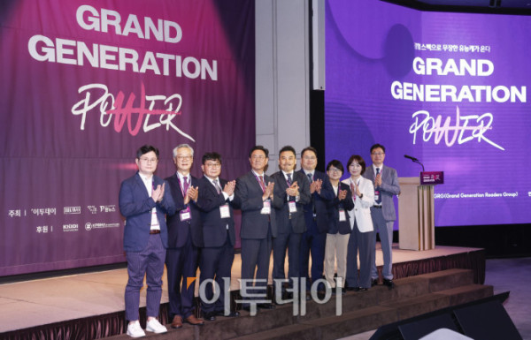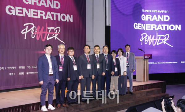 ▲17일 서울 중구 앰배서더 서울 풀만 호텔에서 열린 ‘2025 그랜드 제너레이션 콘퍼런스(GGC)’에서 참석자들이 기념촬영을 하고 있다. 왼쪽부터 이충우 숙명여대 실버비즈니스학과 교수, 조성권 이투데이피엔씨 미래설계연구원장, 신동민 이투데이피엔씨 대표, 이종재 이투데이그룹 부회장, 서용구 숙명여대 경영학부 교수, 이석훈 약사신문 대표, 주경미 고려대 약학대학 박사, 이현이 그랜드제너레이션그룹 리더, 방준석 숙명여대 약학대학 교수. 조현호 기자 hyunho@