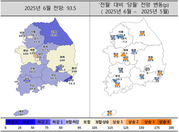 비수도권은 6.1p 상승한 92.5로 집계됐다. 광역시는 94.6, 도 지역은 90.9로 각각 3.7p, 7.8p 올랐다. 광역시는 대전(76.4→108.3)의 오름폭이 가장 컸고 울산(86.6→100.0)과 세종(118.7→123.0)도 상승했다. 광주(94.1→80.0)와 부산(86.3→73.3)은 하락했고 대구(83.3)는 지난달과 같았다.