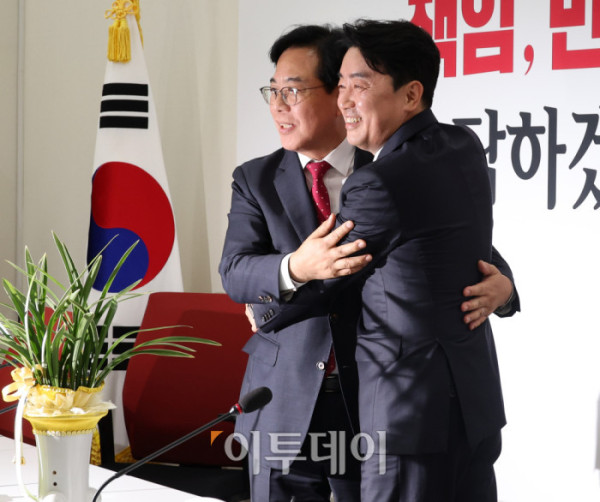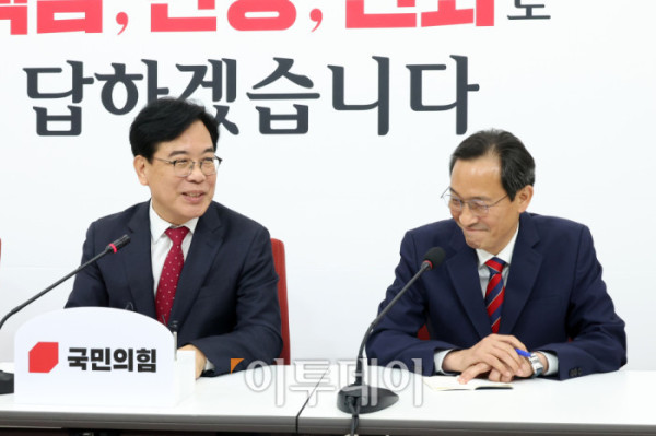 ▲우상호(오른쪽) 대통령실 정무수석이 17일 서울 여의도 국회에서 송언석 국민의힘 원내대표를 예방하고 있다. 고이란 기자 photoeran@