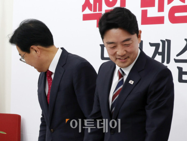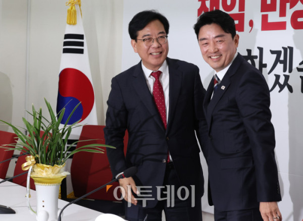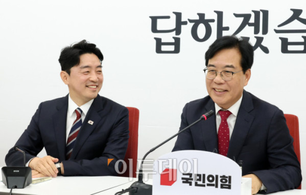 ▲강훈식(왼쪽) 대통령 비서실장이 17일 서울 여의도 국회에서 송언석 국민의힘 원내대표를 예방하고 있다. 고이란 기자 photoeran@