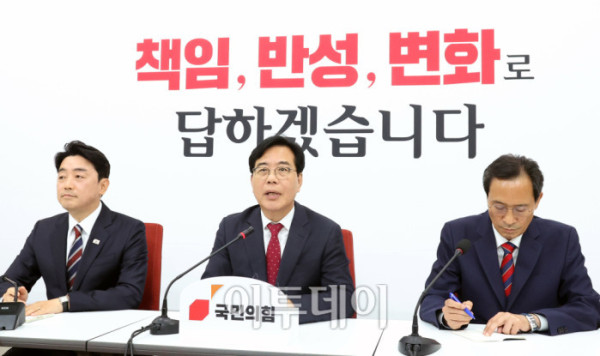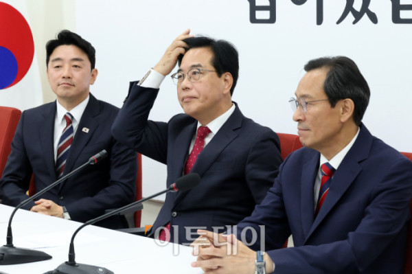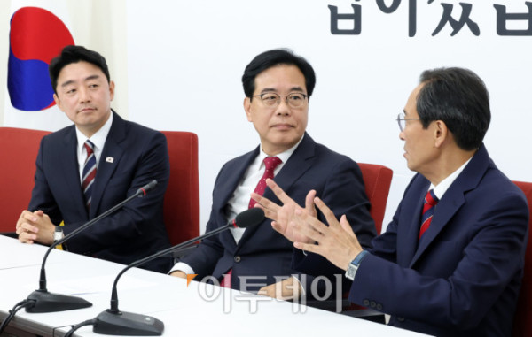 강훈식 대통령 비서실장과 우상호 정무수석이 17일 서울 여의도 국회에서 송언석 국민의힘 원내대표를 예방하고 있다. 고이란 기자 photoeran@