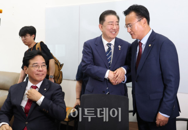 ▲김병기 더불어민주당 대표 직무대행 겸 원내대표와 송언석 국민의힘 원내대표, 유상범 법제사법위원회 국민의힘 간사가 18일 추가경정예산안 처리와 원 구성 문제 등을 논의하기 위해 민주당 원내대표실에서 만나 대화하고 있다. 고이란 기자 photoeran@