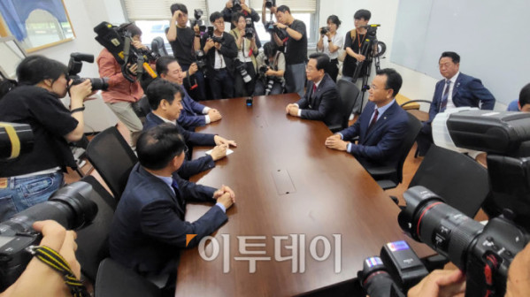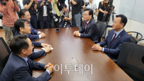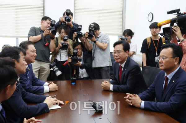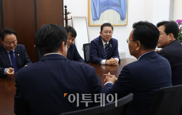 ▲김병기(오른쪽 세번째) 더불어민주당 대표 직무대행 겸 원내대표와 송언석(오른쪽) 국민의힘 원내대표, 유상범(오른쪽 두번째) 법제사법위원회 국민의힘 간사가 18일 추가경정예산안 처리와 원 구성 문제 등을 논의하기 위해 민주당 원내대표실에서 만나 대화하고 있다. 고이란 기자 photoeran@