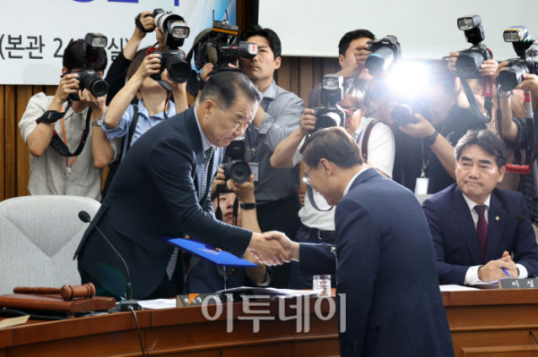 ▲이종석(오른쪽) 국가정보원장 후보자가 19일 서울 여의도 국회 정보위원회에서 열린 인사청문회에서 선서를 마치고 신성범 위원장에게 선서문을 전달하고 있다. 고이란 기자 photoeran@