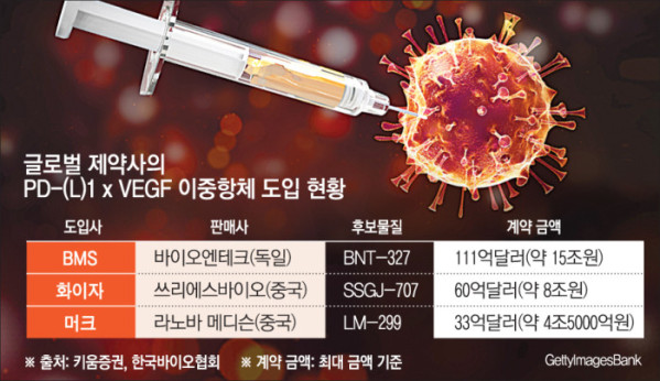 글로벌 제약사들의 기술 도입과 파트너십 경쟁은 본격화됐다. BMS는 이달 초 독일 바이오엔테크와 파트너십을 맺고 PD-(L)1 x VEGF 이중항체 후보물질 BNT327 개발을 위해 최대 111억 달러(약 15조 원) 규모의 계약을 체결했다. 이 물질은 비소세포폐암과 소세포폐암의 1차 치료제로 개발 중이다.