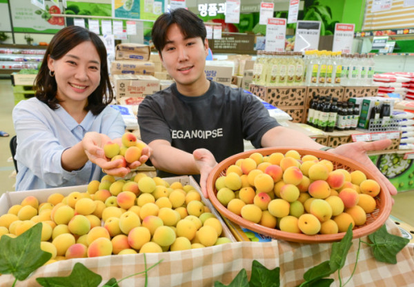 ▲19일 서울 서초구 하나로마트 양재점에서 모델들이 여름 한정판 과일 ‘남고 홍매실’을 선보이고 있다. (사진제공=농협유통)