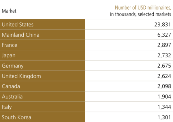 전 세계 백만장자 순위 3~6위는 프랑스(289만7000명), 일본(273만2000명), 독일(267만5000명), 영국(262만4000명)이다. 7∼9위는 캐나다, 호주, 이탈리아였다. 이 밖에 백만장자가 100만 명이 넘는 나라로는 네덜란드, 스페인, 스위스가 있었다.