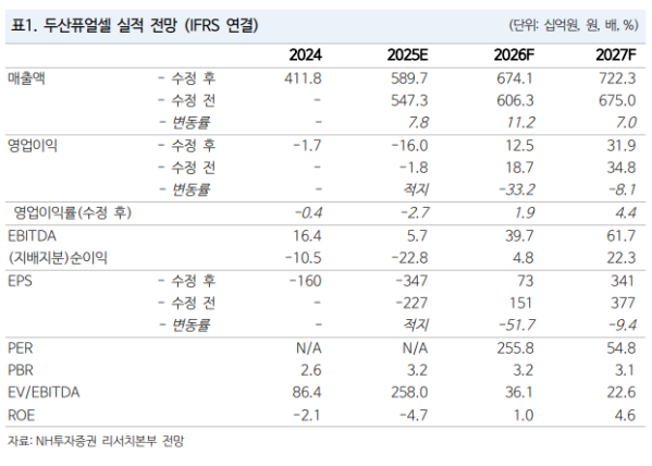 정연승 NH투자증권 연구원은 “두산퓨얼셀의 올해와 내년 매출 추정치를 각각 8%, 11% 상향 조정한다”며 “순차입금 감소도 반영했으며 연료전지 가격 하락으로 올해 영업이익 추정치는 하향했지만, 1분기를 저점으로 2분기부터 수익성 회복이 예상된다”고 밝혔다.
