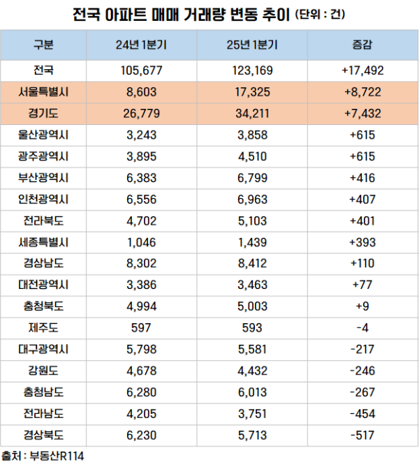 특히 서울의 증가세가 두드러진다. 서울에서는 올 1분기 1만 7325건이 매매 됐는데 이는 전년 동기(8603건)보다 2배 이상 증가한 수치다. 1년 새 8722건이 증가해 전국에서 가장 많은 증가량을 기록했으며, 이는 전국 전체 증가량의 절반에 가까운 양으로 수도권 내에서도 서울이 주도적으로 회복 흐름을 이끌고 있다는 점에서 주목된다.
